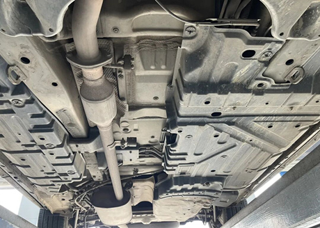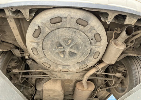 Observando a parte central do chassi, a carroceria em ambos os lados do tubo de escape é protegida por placas plásticas, e o espaço ao lado do tubo de escape é reservado para o eixo de transmissão dos modelos com tração nas quatro rodas.