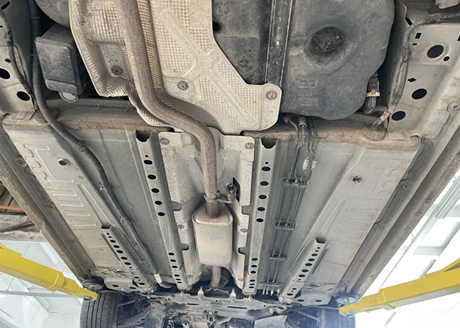 As shown in the figure below, there are no protective plates at the bottom of the engine and gearbox, only small plastic protective plates on both sides. The front part of the plastic protective plate on the right side has been scraped off, and there is a lot of oil stains on the bottom of the gearbox and the subframe on this side.