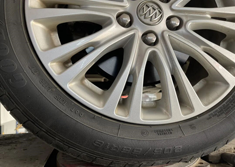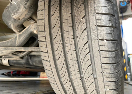 Primeiro, verifique os pneus. Os quatro pneus são originais de fábrica, como mostra a imagem a seguir. O número 1717 na lateral do pneu indica que ele foi produzido na 17ª semana de 2017, há mais de 8 anos.