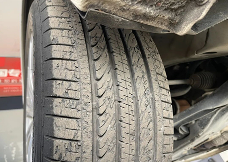 Os pneus são produtos de borracha e, embora tenham uma vida útil curta, são usados por muito tempo, resultando em um envelhecimento significativo da borracha. Observando o pneu dianteiro na imagem, nota-se que há muitas rachaduras na banda de rodagem e blocos de borracha se desprenderam. O motorista explicou que isso ocorre porque a roda dianteira é a motriz e o atrito entre ela e o solo é maior, resultando em um desgaste mais acentuado do pneu.