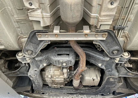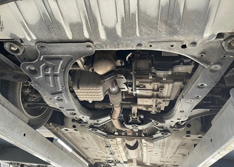 Após levantar completamente o carro, pode-se ver que não há uma grande placa de proteção na parte inferior do motor e da caixa de câmbio, apenas uma pequena placa de proteção em um dos lados do motor.