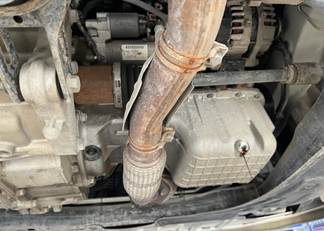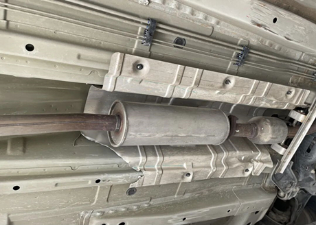 Ao observar a parte central do chassi, não há placas de proteção ou blindagem, mas também não há sinais de ferrugem, indicando que a carroceria do Envision cumpre bem sua função de prevenção contra corrosão. Há arranhões na parte inferior do tubo de escape central e um pedaço faltante da placa de isolamento na parte superior. O técnico disse que isso foi causado por atrito com o solo, mas felizmente as outras peças estão em perfeitas condições.