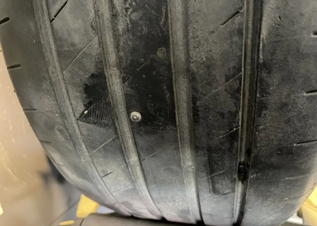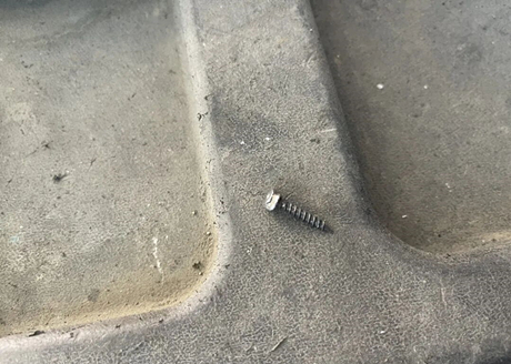 A posição do prego no pneu é no meio da superfície. Em geral, se você perceber que o pneu foi perfurado por um prego desse tipo e a pressão estiver significativamente baixa, não hesite em ir imediatamente a uma oficina mecânica para inspeção e reparo, pois esses pregos costumam ser mais compridos e podem perfurar o pneu completamente.