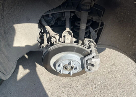 As rodas foram rapidamente removidas pelo mecânico e fixadas com cinco tampas de rosca, como mostrado na figura abaixo. É possível ver as três barras de ligação, os amortecedores e as molas na parte superior da suspensão traseira, bem como duas barras de ligação na parte inferior. A suspensão traseira é do tipo independente de cinco braços, e o mecânico afirmou que seu desempenho é excelente na categoria.