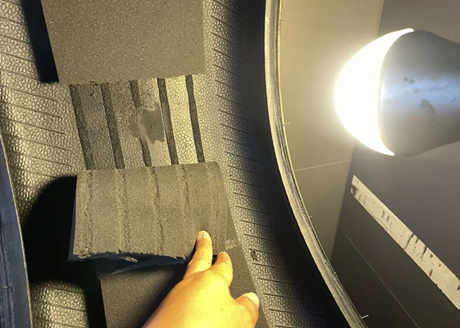 O técnico posicionou o pneu para o reparo e foi possível ver um círculo de espuma na superfície interna do pneu, também conhecido como algodão silencioso, que reduz principalmente o ruído. Em termos mais técnicos, refere-se à capacidade de absorver e bloquear o ruído gerado pelo rolamento do pneu, bem como o ruído gerado pelos sulcos da banda de rodagem.