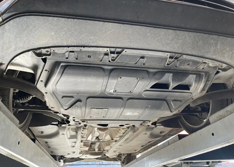 Levante o carro para observar o chassi, como mostrado na imagem a seguir. Há uma grande placa protetora de plástico na parte inferior do motor e da caixa de câmbio, e dois orifícios na posição da caixa de câmbio. O técnico disse que servem para refrigerar a caixa de câmbio.