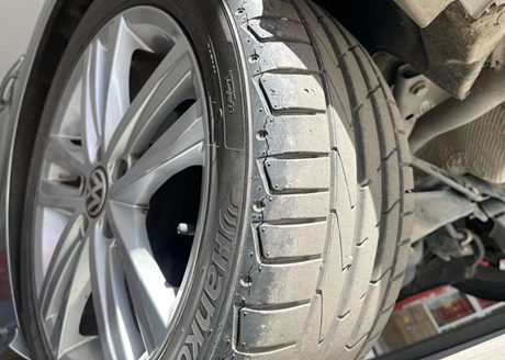 Ao verificar os pneus, o mecânico constatou que o estado dos dois pneus traseiros era muito ruim, como mostra a imagem abaixo. Havia rachaduras grandes e visíveis nas bordas dos pneus, e o mecânico afirmou que pneus nessas condições representam riscos significativos à segurança.