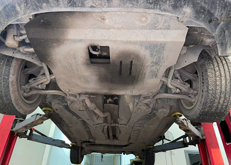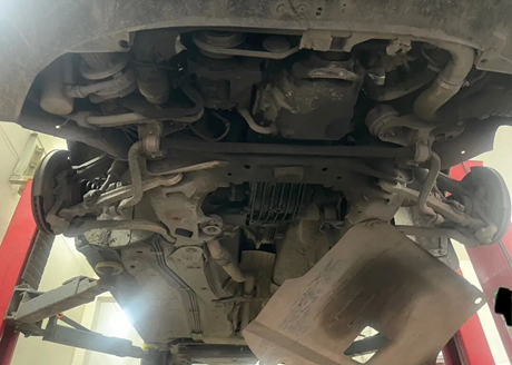 Após inspecionar o chassi, o técnico prosseguiu com a verificação da origem do ruído anormal na caixa de câmbio, conforme mostrado na imagem a seguir. A proteção inferior foi removida, revelando que a caixa de câmbio estava praticamente envolta em borra de óleo. O técnico pediu a outro mecânico que ligasse o motor e engatasse uma marcha dentro do carro, confirmando que o problema estava na caixa de câmbio, como se uma peça danificada estivesse presa na engrenagem.