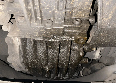 As manchas de óleo na placa protetora provêm da caixa de engrenagens, conforme mostrado na figura abaixo. Há muita borra no fundo da caixa de engrenagens, que está vazando pelo retentor de óleo na posição do semieixo.