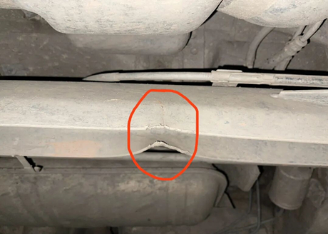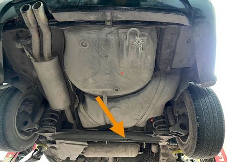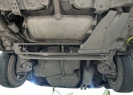 A suspensão traseira é do tipo eixo de torção, não independente, e o tanque de combustível está localizado atrás da suspensão. Atualmente, poucos carros são projetados com o tanque de combustível nessa posição. Em caso de colisão traseira, o tanque de combustível pode ser facilmente comprimido. Há um problema com a suspensão traseira, conforme indicado pela seta na figura abaixo, que apresentou deformação.