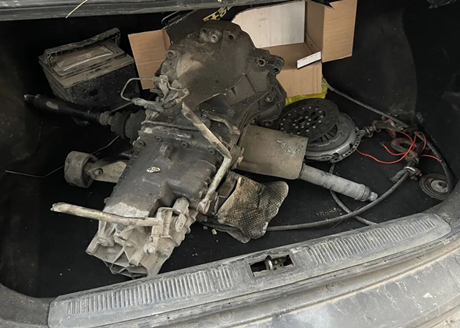 Com a autorização do proprietário do carro, o mecânico rapidamente encontrou todo o conjunto da transmissão na fábrica de desmanche, como mostra a imagem abaixo, juntamente com dois semieixos danificados e até mesmo os discos e platôs da embreagem. O mecânico disse que os discos e platôs não tinham sido muito usados e obviamente foram reparados antes de serem descartados.