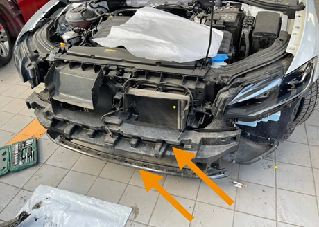 Vamos dar uma olhada rápida no interior do para-choque dianteiro do Volkswagen Lavida. A remoção do para-choque foi necessária devido a arranhões na parte frontal e danos na faixa decorativa inferior. Para substituí-lo, o para-choque precisa ser removido.