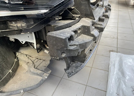 As shown in the picture below, the front bumper has been removed by the master. It can be seen that the front part of the internal collision beam is made of black cushioning plastic, and the lower part is made of anti roll bar iron.