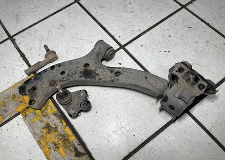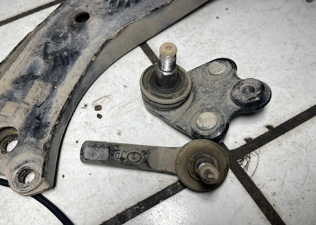 Vamos dar uma olhada nos componentes do chassi desmontados. Há um total de três peças na imagem a seguir. A peça superior esquerda é a junta esférica da barra de direção externa, a maior é o braço de suporte inferior e a peça inferior esquerda é o... junta esférica do braço de controle .